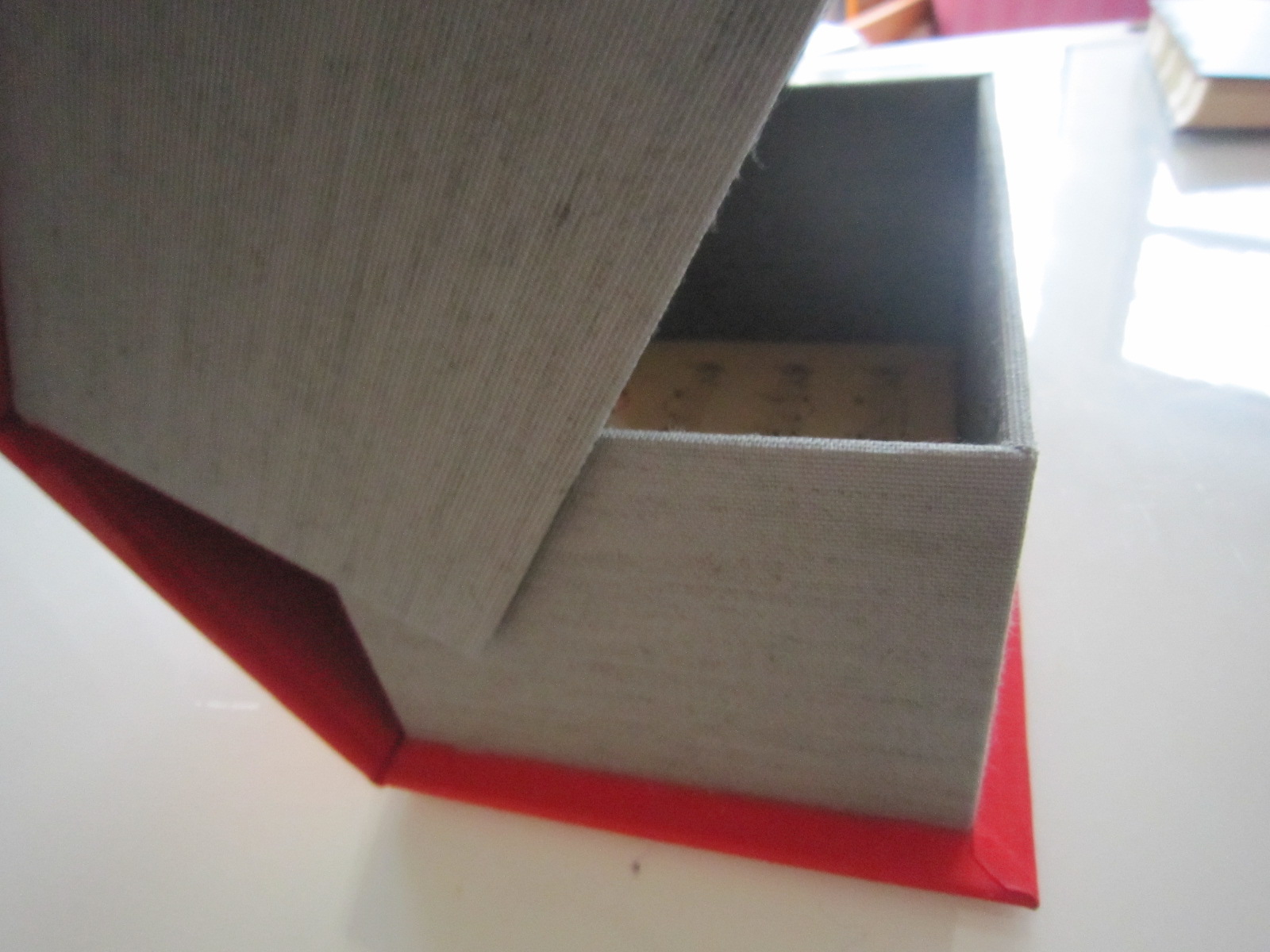 The rest of the box is made of more bookboard, covered in bookcloth and lined with found sheet music. The slot in the box's bottom wall is there so you can lift out its contents without turning the box upside down. I measured this box to fit the two hardbound books I had just made, but it is also the perfect size for 5x7 photographs, or drug paraphernalia or prophylactics, you know, whatever.